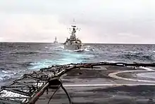 On 9 November 1970 the aircraft carrier Ark Royal collided with the Soviet Kotlin-class destroyer, Bravyy, which had been shadowing the carrier during exercises in the Mediterranean and cut across the bows of Ark Royal while the carrier was launching aircraft. Several of Bravyy's crew were washed overboard in the incident with Yarmouth rescuing two of them, although two of the seven Soviet sailors were lost in the accident.[19][20] A few days later, the tanker Esso Chile suffered an explosion off Malta which had killed one and injured two of the tanker's crew. Yarmouth's helicopter flew a doctor over to Esso Chile and ferried the wounded to shore for further medical treatment.[20]