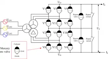 ![]() A 12-pulse HVDC converter using mercury arc valves, with a bypass valve and bypass switch across each of the two 6-pulse bridges |