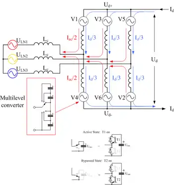 ![]() Operating principle of Modular Multi-Level Converter (MMC) for HVDC, with four series-connected submodules per valve. For clarity only one phase of the three is shown. |