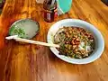 海南粉 | 海南粉 | Hǎinán fěn | This dish is common in Hainan. Rice noodles are served at room temperature with various toppings, most commonly, roasted peanuts, fresh coriander, pickled vegetables, thin strips of meat, and a thick sauce, sometimes containing thin strips of bamboo. It is typically served with a complimentary bowl of clear or somewhat clear broth made from pig offal and/or chicken powder. | |