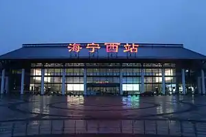 Hainingxi (Haining West) railway station (simplified Chinese: 海宁西站; traditional Chinese: 海寧西站; pinyin: Hǎiníng xī zhàn) is a railway station on the Shanghai–Hangzhou high-speed railway located in Haining, Jiaxing, Zhejiang, China. It opened on 26 October 2010.[1]