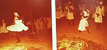 Vodou's nocturnal gatherings are often referred to as the dans ("dance"), reflecting the prominent role that dancing has in such ceremonies.[251] Their purpose is to invite a lwa to enter the ritual space and possess one of the worshippers, through whom they can communicate with the congregation.[330] The success of this procedure is predicated on mastering the different ritual actions and on getting the aesthetic right to please the lwa.[330] The proceedings can last for the entirety of the night.[251]