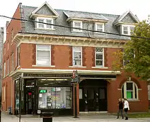 The Hall-Benedict Drug Company Building is located northeast of downtown New Haven, on the south corner of Orange and Linden Streets in the East Rock neighborhood. It is a 2-1/2 story brick structure, built with load-bearing brick walls and a roof that has a steep mansard facade in front and a slightly sloping shed roof to the rear. The front roof face has modillion blocks at the eave, and is pierced by three dormers; the outer two have gabled roofs, while that at the center has a shed roof. The front facade faces Orange Street, and is asymmetrical, with a glassed storefront at the corner that has a recessed entrance. The main building entrance is near the center of the facade, under a continuation of the cornice that extends across the storefront's top. A round-arch window occupies the rightmost bay of the front. Upper-level windows are sash with fixed diamond-light transom windows above.[2] Despite efforts of local preservationists, the original storefront windows were removed in 2020 and replaced with historically inappropriate modern plate-glass windows.