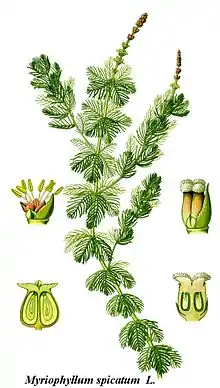 The Haloragaceae ( alternate spelling Halorrhagidaceae) are very diverse in habit, including both small trees and submerged aquatics. Most members of the Haloragaceae are herbaceous, and most of those in turn are perennials, though some species are annuals. In contrast however, members of the genus Haloragodendron are woody. Most species of Myriophyllum are monoecious while most other taxa have hermaphrodite flowers. The flowers are usually small and inconspicuous, but some genera can have more "showy" conspicuous flowers (Haloragodendron, Glischrocaryon). Flowers are usually radially symmetrical, and unusual for core eudicots, merosity is (2-3)-4 parted. Petals are usually keeled or hooded when present. In Myriophyllum female flowers usually lack a perianth. They have (2-)4-8 stamens and an inferior ovary of (2-)4 carpels. In Myriophyllum the fruit is a schizocarp of 1-seeded 'nutlets' other genera can have nuts or drupes that can be winged or inflated.[2][3] The genus Gunnera, formerly included here are now the separate family Gunneraceae.