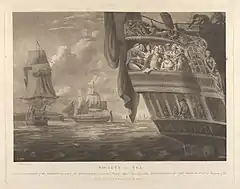 King George III came to view the scene of the wreck with several members of his family.[24] The Dorset poet William Holloway wrote a poem about the royal visit to the spot. An anonymous poem was published called the "Monody on the Death of Captain Pierce".[25] On 30 January 1786 the Eidophusikon show reopened at Exeter Change in an auditorium that held 200 people, a show that combined pictures with lighting effects and sounds. Opening just three weeks after the tragedy, the new show included an "exact, awful and tremendous Representation of that lamentable event".[26] The show was put on by Philip James de Loutherbourg, a former scenery painter.[27] Henry Meriton and John Rogers, two officers who managed to escape, later published their account of the events.[28][lower-alpha 2] To commemorate the event, Augustus Frederic Christopher Kollmann composed "The shipwreck, or the Loss of the East Indiaman Halsewell", an orchestral symphony.[29] Henry James Pye published a poem that began,