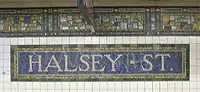 Both platforms have their original mosaic tile band that is colored blue and green with yellowish accents.[17] "H" tablets on blue background run along the tile bands at regular intervals.[17] The name tablets read "HALSEY ST." in gold serif font on a blue background and a green, yellow, and blue border.[17] There are also directional signs in gold serif font and outline on a blue background.[17] One of the platforms formerly had two bathrooms. Yellow i-beam columns run along both platforms at regular intervals with alternating ones having the standard black station name plate in white lettering.[17]
