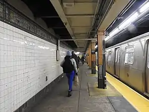 Both platforms have their original mosaic tile band that is colored blue and green with yellowish accents.[17] "H" tablets on blue background run along the tile bands at regular intervals.[17] The name tablets read "HALSEY ST." in gold serif font on a blue background and a green, yellow, and blue border.[17] There are also directional signs in gold serif font and outline on a blue background.[17] One of the platforms formerly had two bathrooms. Yellow i-beam columns run along both platforms at regular intervals with alternating ones having the standard black station name plate in white lettering.[17]