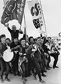 The parade is full of passion, accompanied by the sound of trumpets, drums, and the cry of "Oicho, oicho". Then, they reach a fever pitch. Participants are jostling and pushing around each other with festive excitement and they form a swirling frenzy. [1] It is called "Gekineri".[6]