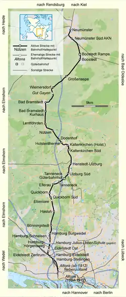 The line was originally planned as narrow gauge railway, but it was then built as standard gauge. It largely followed the Altona-Kiel road (Altona-Kieler Chaussee) built between 1830 and 1832 with its southernmost section running north along Holstensraße from the Kaltenkirchen station (Kaltenkirchener Bahnhof) in Gählerplatz in Altona. It ran over the Hamburg-Altona link line using folding track (this was able to fold to give one line or the other a clear passage), running on street level from Schulterblatt station (about where Haubachstraße now runs) to the Viktoria barracks. Further north it crossed the border of the common customs territory of Hamburg/Altona where the Bahnhof Nebenzollamt (minor customs office railway station) was established. Customs checks were carried out there until 1888 when Hamburg joined the Zollverein (German customs union).
