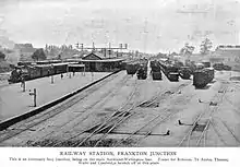Frankton Junction station consisted of an island platform located on the NIMT just north of the junction between the ECMT and NIMT. It had two signal boxes, and a locomotive depot was located in the Vee of the junction.[4] In 1909 a new, larger station was built to cope with the extra traffic of the through line to Wellington, 16 chains (1,100 ft; 320 m)[5] to the north.[6] The first Auckland - Wellington through expresses ran on 14 February 1909, taking 19 hours 13 minutes, and stopping at Frankton.[7]