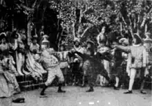 The pioneering Parisian filmmaker Georges Méliès had multiple cinematic encounters with the plays of William Shakespeare. The first, his 1901 film The Devil and the Statue, had alluded to Romeo and Juliet by including a balcony scene and Venetian lovers called Roméo and Juliette. (An earlier Méliès work, the 1899 film Robbing Cleopatra's Tomb, is sometimes called simply Cléopatre, but it is not connected to Shakespeare's Antony and Cleopatra.)[2] Méliès also dabbled in Shakespeare in his 1905 film The Venetian Looking-Glass, which incorporates the character of Shylock from The Merchant of Venice.[3] However, these earlier films had merely borrowed elements from Shakespearean works; by contrast, Méliès's 1907 version of Hamlet was a true Shakespearean adaptation.[2]