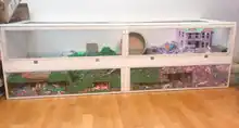 Aquariums can be modified to serve as hamster cages.[11] Hamsters cannot chew glass aquariums because the walls are smooth and there are no projections.[11] Glass aquariums can be heavy and difficult to move, however, and it may be challenging to find an appropriate top to contain the hamster, especially if toys are put in the aquarium that could allow the hamster to escape over the sides.[11] An aquarium must provide at least 775 in2 (5,000 cm2) of floor space. Thus, a 75-gallon aquarium is the minimum recommended size for a hamster, but larger sizes are always encouraged.