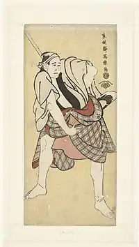 The powerful Mizuemon, resentful at having lost a sword fight to his patron Ishii Hyōei, murders Hyōei and steals from him a secret book on Japanese swordsmanship. Hyōei's sons attempt revenge, but in the third act Mizuemon kills Hyōei's eldest son Genzō and his wife at the Abe River in neighbouring Suruga Province. Sharaku depicts Mizuemon at the scene of his murder of Genzō. The print pairs with the one of Bandō Mitsugorō II as Ishii Genzō.[12]