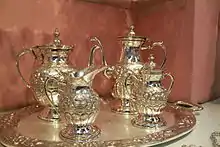 Today, the best known work of this type is the silver objects, especially jewelry, produced in the mountain town of Taxco, about three hours from Mexico City.[2][8] During the colonial period, the area was rich in silver, making one man, José de la Borda, particularly wealthy. However, the mines eventually dried up and the working of this metal was down to one old silversmith by 1931, when American William Spratling arrived. Believing that the handcrafting of silver should be done where the metal has a history, Spratling convinced two young gold smiths in Iguala to move to Taxco to help him open a shop. He also believed that the role of designers, was to “utilize and dignify” the material, which was a new ideal for craftsmen at the time. Spratling's shop was not only a success, he attracted apprentices who then went on to open their own shops, including noted artisans Antonio Castillo and Antonio Pineda. These new generations of silversmiths have also rescued a forgotten technique of combining different metals, which has a pre Hispanic origin, called “wedded metals.”[4]