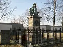 Initially, Winterfeldt was buried at his estate of Barschau; a hundred years later, his body was transferred to the Invalidenfriedhof (military cemetery) at Berlin. A statue, which stands on the Wilhelmplatz there, was erected to his memory, and another was erected in the Bodemuseum on the Museumsinsel. Another forms part of the memorial to Frederick the Great at the boulevard Unter den Linden.[4] In 1851 his name was inscribed on Frederick the Great's Equestrian Statue.[6]