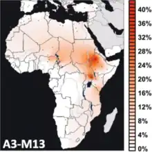 Haplogroup A3b2-M13 is common among the Southern Sudanese (53%),[22] especially the Dinka Sudanese (61.5%).[30] Haplogroup A3b2-M13 also has been observed in another sample of a South Sudanese population at a frequency of 45% (18/40), including 1/40 A3b2a-M171.[23]