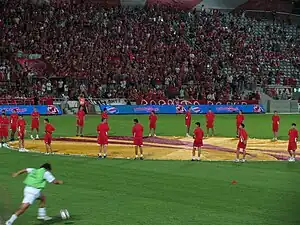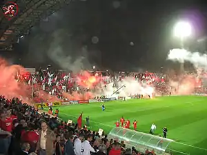 Ultras Hapoel often wave flags emblazoned with the faces of Che Guevara and Karl Marx, as well as banners with the slogan "Workers of the world, unite!".[13] The club ultras has friendships with many other antifa supporter groups, including strong bonds with fans of FC St. Pauli, Standard Liège, Omonia Nicosia, and Celtic F.C.[9][10][11][12]