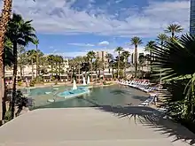 Upon its opening, the resort included the Hard Rock Beach Club, featuring a pool, cabanas, and a sandy beach.[25] Each year from 1996 to 2006, the hotel hosted beach volleyball tournaments.[lower-alpha 2] During the 1999 expansion, the pool and beach club area was expanded by two acres,[284] and became one of the most popular party spots in Las Vegas.[104] The pool included two floating craps tables.[45] In 2004, the resort launched a public pool party known as Rehab, which became a successful, annual event until its end in 2018.[285]