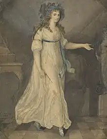 There is no evidence of her early art education but it has been stated that she received lessons from John 'Warwick' Smith, a British watercolour landscape artist, 'before her marriage'.[8] The picture of the sculptor Anne Seymour Damer was painted by Harriet Carr in 1788 when she was in her teens. The painting is in the collection of The National Galleries of Scotland.[2]