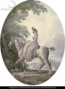 John and Harriet gained entry to Roman society through Thomas Jenkins who had received letters from Sir John Dick who had been British consul at Leghorn.[5] This enabled Harriet to meet many people and it is noted that her status as an artist attracted some attention. It was noted that some ladies from society visited to view her paintings and this enhanced her social status. Her riding attracted attention and it was noted in the letters home that Harriet's riding was 'the admiration of all the Roman ladies who never venture out of their carriage.'[9] Harriet was pictured riding in a painting by Jean-Baptiste Thian: Portrait of the Artist, Miss Harriet Carr, on Horseback in the Boboli Gardens, Florence' 1794.[10]