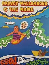 The Harvey Wallbanger was created in 1969 as a marketing campaign by McKesson Imports Company, importer of Galliano, as a means of driving sales of Galliano. The campaign was headed by George Bednar, marketing director of McKesson, and a cartoon character was commissioned from graphic artist William J. "Bill" Young in Lima, New York,[1][2] with the tagline that Bednar claimed to have penned: "Harvey Wallbanger is the name. And I can be made!"[3][4][5] The Harvey Wallbanger character was a surfer, appearing in various ads during the campaign, and was mentioned in print as early as 1969,[3] continuing into the 1970s.[6][7]