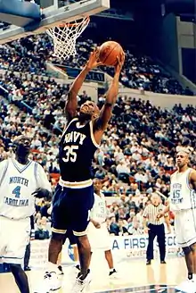 ![]() Booker shoots a layup during Navy's 1998 NCAA tournament game against North Carolina | |