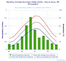 - ↑ "WMO Climate Normals for HAVRE/CITY-COUNTY ARPT MT 1961–1990". National Oceanic and Atmospheric Administration. Archived from the original on September 6, 2023. Retrieved September 6, 2023.