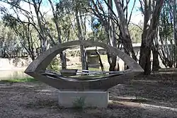 The first bridge over the Murrumbidgee River at Hay was built in 1872 at a cost of £20,000. The structure included a turntable which enabled the middle-section to be swung open to allow the passage of steamers. The opening of the Hay Bridge was delayed while the approaches were formed. It was finally opened on 31 August 1874 by the Colonial Secretary of New South Wales, Henry Parkes. The old bridge was eventually replaced by a new one, opened in June 1973. The old Hay Bridge was subsequently demolished. The turntable, last used in 1946, was placed in the river-bend just north of where the bridge had been.[4]