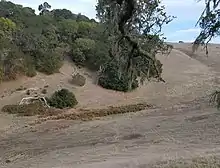 Preferential groundwater flow along the fault emerges as a spring supporting the riparian vegetation in the center of this photo of Taylor Mountain Regional Park. The spring is the source of Cooper Creek which flows northward through a deeply incised canyon along the fault on the southern edge of Santa Rosa, California, to a confluence with Matanzas Creek at Doyle Community Park.