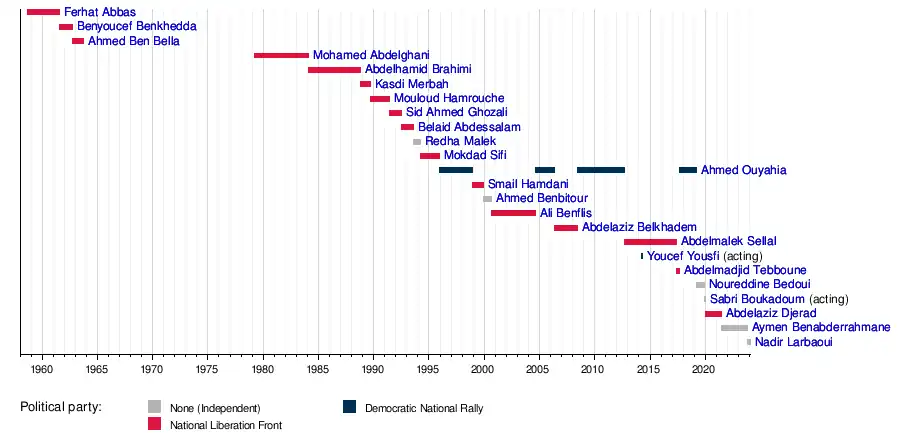 A total of twenty people have served as Prime Minister of Algeria (not counting two Presidents of the GPRA and two Acting Prime Ministers). Additionally, one person, Ahmed Ouyahia, has served on three non-consecutive occasions.