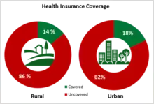 Policies are available that offer both individual and family cover. Out of this 3.9%, health insurance accounts for 5-10% of expenditure, employers account for around 9% while personal expenditure amounts to an astounding 82%.[2] In the year 2016, the NSSO released the report "Key Indicators of Social Consumption in India: Health" based on its 71st round of surveys. The survey carried out in the year 2014 found out that, more than 80% of Indians are not covered under any health insurance plan, and only 18% (government funded 12%) of the urban population and 14% (government funded 13%) of the rural population was covered under any form of health insurance.[3]