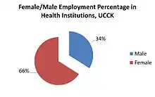 The Statistical Agency of Kosovo is a professional institution operating since 1948, located in Pristina, which collects, processes and publishes official statistical data.[1] Since 2011, this agency functions under the Prime Minister’s office. It is funded by the Kosovo Consolidated Budget and it is supported by donors.[8] They have professional and technical cooperation with all ministries of Kosovo's Government, especially with the Ministry of Economy and Finance, the Central Bank of Kosovo, Eurostat, International Monetary Fund, World Bank, SIDA, DFID, UNFPA, UNDP, UNICEF and many other international institutions.[1] According to a study made by Kosovo's Ministry of Public Administration, the number of female employees in Kosovo's health institutions has been distinctly bigger during the previous years. In 2010 there were 8,928 female employees and 4,282 males.[9] This number had a minor increase in favor of male employees by 1% in 2012.[1]