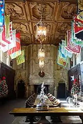 The refectory was the only dining room in the castle, and was built between 1926 and 1927.[173] The choir stalls which line the walls are from the La Seu d'Urgell Cathedral in Catalonia[178] and the silk flags mounted on the walls are Palio banners from Siena.[lower-alpha 20][180] Hearst originally intended a "vaulted Moorish ceiling" for the room but, finding nothing suitable, he and Morgan settled on the Italian Renaissance example, dating from around 1600, which Hearst purchased from a dealer in Rome in 1924.[181] Victoria Kastner considered that the flat roof, with life-size carvings of saints, "strikes a discordant note of horizontality among the vertical lines of the room".[182] The style of the whole is Gothic, in contrast to the Renaissance approach adopted in the preceding assembly room.[160] The refectory is said to have been Morgan's favorite interior within the castle.[183] The design of both the refectory and the assembly room was greatly influenced by the monumental architectural elements, especially the fireplaces and the choir stalls used as wainscoting, and works of art, particularly the tapestries, which Hearst determined would be incorporated into the rooms.[184] The central table provided seating for 22 in its usual arrangement of two tables, which could be extended to three or four, on the occasion of larger gatherings.[185] The tables were sourced from an Italian monastery[186] and were the setting for some of the best pieces from Hearst's collection of silverware. One of the finest is a wine cooler dating from the early 18th century and weighing 14.2 kg by the Anglo-French silversmith David Willaume.[187]