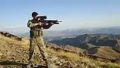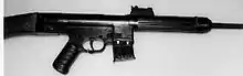 Initial production G3 rifles differed substantially from more recent models; early rifles featured closed-type mechanical flip-up sights (with two apertures), a lightweight folding bipod, a stamped sheet steel handguard, a wooden buttstock (in fixed stock models) or a telescopic metal stock.[7] Before delivery to the Bundeswehr, each G3 went through functional checks, zeroing the sight line (Anschießen) and a shooting test at the factory. In the process, five shots were fired at a target at 100 metres (109 yd) with particularly accurate sighting-in ammunition. The 5-shot group could not exceed 120 mm (4.7 in) (1.2 mil/4.13 MOA) diameter. The weapon was modernized during its service life (among other minor modifications it received new sights, a different flash suppressor, and a synthetic handguard and shoulder stock), resulting in the most recent production models, the G3A3 (with a fixed polymer stock) and the G3A4 (telescoping metal stock). The rifle proved successful in the export market, being adopted by the armed forces of over 40 countries.[7] Of that figure, 18 countries undertook domestic production of the G3 under license.[9] Known manufacturers of the weapon included France (MAS), Greece (Hellenic Defence Systems), Iran (Defense Industries Organization), Luxembourg (Luxemburg Defense Technologie), Mexico, Myanmar, Norway (Kongsberg Våpenfabrikk), Pakistan (Pakistan Ordnance Factories), Portugal (FBP), Saudi Arabia (Military Industries Corporation (Saudi Arabia)), Sweden (Husqvarna Vapenfabrik AB and FFV Carl-Gustaf in Eskilstuna), Thailand, Turkey (MKEK) and the United Kingdom (Royal Ordnance).[7]