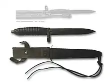 Standard accessories supplied with the rifle include: a detachable bipod (not included with rifles that have a perforated plastic handguard), sling, cleaning kit and a speed-loading device. Several types of bayonet are available for the G3, but with few exceptions they require an adapter to be inserted into the end of the cocking tube. The most common type features a 634 inch spear-point blade nearly identical with the M7 bayonet, but with a different grip because of its mounting above the barrel. The weapon can also mount a 40 mm HK79 under-barrel grenade launcher, blank firing adapter, a straight blowback bolt (called a "PT" bolt, lacks rollers) used for firing 7.62×51mm ammunition with plastic bullets, a conversion kit used for training with .22 Long Rifle ammunition and a sound suppressor (that uses standard ammunition).