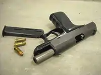 The HK P9 is a semi-automatic pistol from Heckler & Koch in 9×19mm Parabellum, .45 ACP, and 7.65×21mm Parabellum and the first to use a variation of H&K's roller delayed blowback system in a pistol format and polygonal rifling[1] now common in H&K designs.