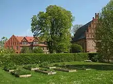 Heiligengrabe Abbey (literally in English: Holy Sepulchre; formerly also known as Techow) was founded here as a Cistercian nunnery in 1289 by Heinrich, Bishop of Havelberg and the Margrave Otto of Brandenburg, initially for 12 nuns. It held an important relic in the form of a Bleeding Host which, so it was said, had been violated in a host desecration by a Jew.