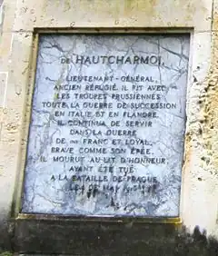 Heinrich Karl Ludwig Herault de Seigneur de Hautcharmoy (1689 in Wesel – 11 May 1757 in Margaret monastery at Prague) was a Prussian Lieutenant-General, Knight of the Black Eagle and commander of Brieg. His family was originally from Kingdom of France, and his father served as subordinate to Friedrich von Schomberg, and was killed with him at the Battle of the Boyne.