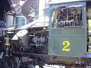 In 1897, Heisler received a patent on a three-truck locomotive.[2] As with Class C Shay locomotives, the tender rode on the third truck. Unlike the Shay, Heisler's design did not have a continuous string of line shafting running the length of the engine. Instead, the tender truck was driven by a line shaft above the shaft driving the main engine trucks, connected to it through spur gears. This patent also covered use of a 4-cylinder 'V4' cylinder configuration.