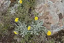 This perennial herb grows 8–60 cm (3.1–23.6 in) tall.[1] The rootstock is woody.[2] The leaves form a rosette at the base and sometimes also higher up the stem. The leaves growing at the base are the largest.[1] They are oblanceolate in shape and are silvery and silky.[2] Dense, many flowered flower heads are present between March and June. The flowers grow in cylindrical cymes located at the ends of branches.[2] The outer parts of the flowers are brown or straw coloured and the insides are tipped with bright yellow.[1]