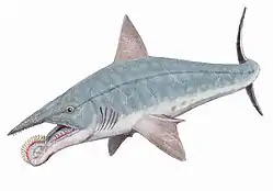 Helicoprion is an extinct genus of shark-like[1] eugeneodont fish. Almost all fossil specimens are of spirally arranged clusters of the individuals' teeth, called "tooth whorls", which in life were embedded in the lower jaw. As with most extinct cartilaginous fish, the skeleton is mostly unknown. Fossils of Helicoprion are known from a 20 million year timespan during the Permian period from the Artinskian stage of the Cisuralian (Early Permian) to the Roadian stage of the Guadalupian (Middle Permian).[2] The closest living relatives of Helicoprion (and other eugeneodonts) are the chimaeras, though their relationship is very distant.[3] The unusual tooth arrangement is thought to have been an adaption for feeding on soft bodied prey, and may have functioned as a deshelling mechanism for hard bodied cephalopods such as nautiloids and ammonoids. In 2013, systematic revision of Helicoprion via morphometric analysis of the tooth whorls found only H. davisii, H. bessonowi and H. ergassaminon to be valid, with some of the larger tooth whorls being outliers.[2]