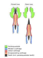 Meckel's cartilage has an additional projection right before the joint with the palatoquadrate. This extra process, unique to Helicoprion, likely served to limit jaw closure to prevent the whorl from puncturing the chondrocranium. Another unique characteristic of Helicoprion is that the preserved labial cartilage forms a synchondrosis (fused joint) with the upper surface of the Meckel's cartilage. This joint is facilitated via a long facet on the upper edge of Meckel's cartilage. The labial cartilage provides lateral support for the tooth whorl, widening near the root of each volution. By wedging into the palatoquadrate while the mouth is closed, the upper edge of the labial cartilage helps to spread out the forces used to limit the extent of the jaw closure. The rear portion of the labial cartilage has a cup-like form, protecting the developing root of the last and youngest volution.[3][9][7]