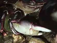 - ↑ Brockerhoff, A.M.; McLay, C.L. (2005). "Factors influencing the onset and duration of receptivity of female purple rock crabs, Hemigrapsus sexdentatus (H. Milne Edwards, 1837) (Brachyura: Grapsidae)". Journal of Experimental Marine Biology and Ecology. 314 (2): 123–135. doi:10.1016/j.jembe.2004.08.018.