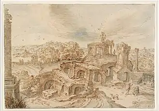 Hendrik van Cleve's drawings were used by contemporary printmakers in Antwerp as designs. Two series of prints after van Cleve's designs were published by the renowned engraver and publisher, Philips Galle. The first series, Regionem, rurium, fundormumq [ue], varii atove [read: atque] amoeni prospectus was published in 1587. It consists of 10 plates that mainly depict inaginary pastoral landscapes with ruins. Hendrik van Cleve is mentioned as the designer on each print and Philip Galle as the engraver. The second series entitled Ruinarum varii prospectus, ruriumq [ue] aliquot delineationes is undated but was likely published around the same time as the first one. The 38 prints show Mediterranean views. It is not clear who engraved this series.[8]