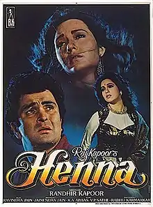Henna is a 1991 Indian romance drama film, written by Khwaja Ahmad Abbas, produced and directed by Randhir Kapoor. It stars Rishi Kapoor, along with Pakistani actress Zeba Bakhtiyar in the title role and Ashwini Bhave. This film was planned and started by director Raj Kapoor, but due to his death during the filming, the remaining portions were directed by his eldest son Randhir.[1] It is considered as the last film of Raj Kapoor. The dialogues of the film were written by the Pakistani writer Haseena Moin. The film was a critical and a commercial success and was also India's submission for the Academy Award for Best Foreign Language Film, but was not accepted as a nominee.[2]