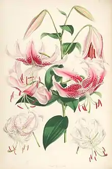 Elwes' horticultural interests largely concentrated on bulbs, and he was said to have the finest collection in private hands. In 1880, he published the magnificent folio Monograph of the Genus Lilium, instigated by Elwes and written with assistance from J. G. Baker at Kew Gardens, but he wrote disappointingly little about his gardening experiences. To ensure that the text was as accurate as possible, and that the range of lilies was as complete as possible, he consulted the greatest botanical experts in the field for help in writing the text. This level of excellence was perpetuated in the illustrations, and Elwes was able to execute his plan to illustrate the monograph with hand-coloured plates by the best available botanical artist, with each member of the genus shown full size. Between March 1877 and May 1880 subscribers received seven parts (at a total cost of seven guineas), illustrated with 48 plates by Walter Hood Fitch (1817–1892). In his garden he was able to grow many of the members of the genus Lilium, becoming a recognised expert in the field. However, Elwes played down his level of knowledge. Some botanists found him a domineering personality. N.D. Riley noted that Elwes "was a giant of a man and a very dominating character." W.T. Stearn noted that his booming voice (which made one commentator quip - "is that a man or a foghorn?") which carried well across his Gloucestershire estate was disconcerting elsewhere.[12]