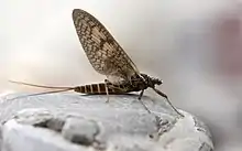 The Heptageniidae (synonym: Ecdyonuridae) are a family of mayflies with over 500 described species mainly distributed in the Holarctic, Oriental, and Afrotropical regions, and also present in the Central American Tropics and extreme northern South America.[1] The group is sometimes referred to as flat-headed mayflies or stream mayflies. These are generally rather small mayflies with three long tails. The wings are usually clear with prominent venation although species with variegated wings are known. As in most mayflies, the males have large compound eyes, but not divided into upper and lower parts.