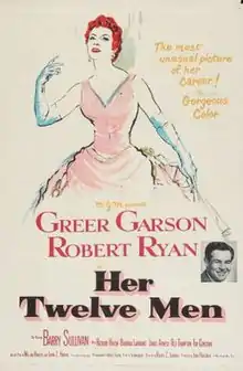 Her Twelve Men is a 1954 American comedy drama film starring Oscar-winning Greer Garson and Robert Ryan, directed by Robert Z. Leonard, and written by William Roberts and Laura Z. Hobson. This MGM production was based on the best-selling pseudo-autobiographical book written by Louise Maxwell Baker, Snips and Snails. Baker herself taught at an all-boys boarding school, as the only female teacher in the school. Subsequently, Louise recounts many of the funny stories from her time as a teacher in Snips and Snails, which then translates into the film, Her Twelve Men.