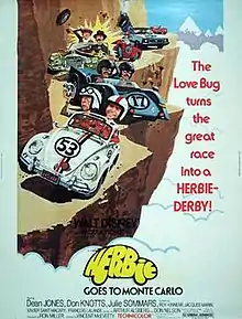 Herbie Goes to Monte Carlo is a 1977 American sports adventure comedy film directed by Vincent McEveety and written by Arthur Alsberg and Don Nelson.[2][3] The film is the third installment in the Herbie film series and the sequel to Herbie Rides Again (1974). In the film, Dean Jones returns as champion race car driver Jim Douglas (reprising his role from The Love Bug, the first film in the series), joined this time by his somewhat cynical and eccentric riding mechanic Wheely Applegate (Don Knotts). The film follows Douglas, Applegate, and Herbie as they participate in the fictional Trans-France Race, a road race from Paris, France, to Monte Carlo, Monaco.