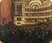 The play was given its premiere on 25 February 1830 by the Comédie-Française in Paris.[2] Today, it is more remembered for the demonstrations which accompanied the first performance and for being the inspiration for Giuseppe Verdi's opera Ernani than it is for its own merits. Hugo had enlisted the support of fellow Romanticists such as Hector Berlioz and Théophile Gautier[3] to combat the opposition of Classicists who recognised the play as a direct attack on their values.